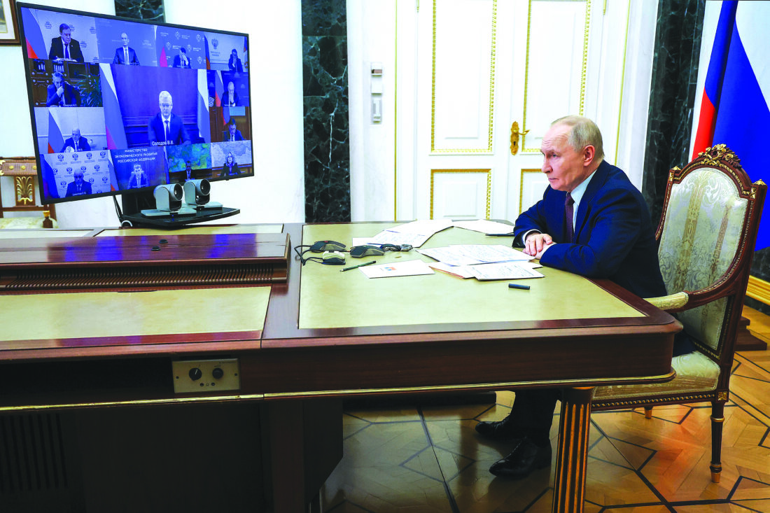 Russian President Vladimir Putin attends a cabinet meeting via videoconference at the Kremlin, in Moscow, Russia, Wednesday, Jan. 21, 2026. (Vyacheslav Prokofyev/Sputnik, Kremlin Pool Photo via AP)