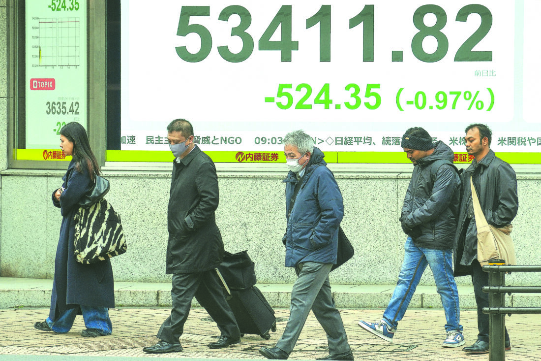 People walk in front of an electronic stock board showing Japan's Nikkei index at a securities firm Monday, Jan. 19, 2026, in Tokyo. (AP Photo/Eugene Hoshiko)