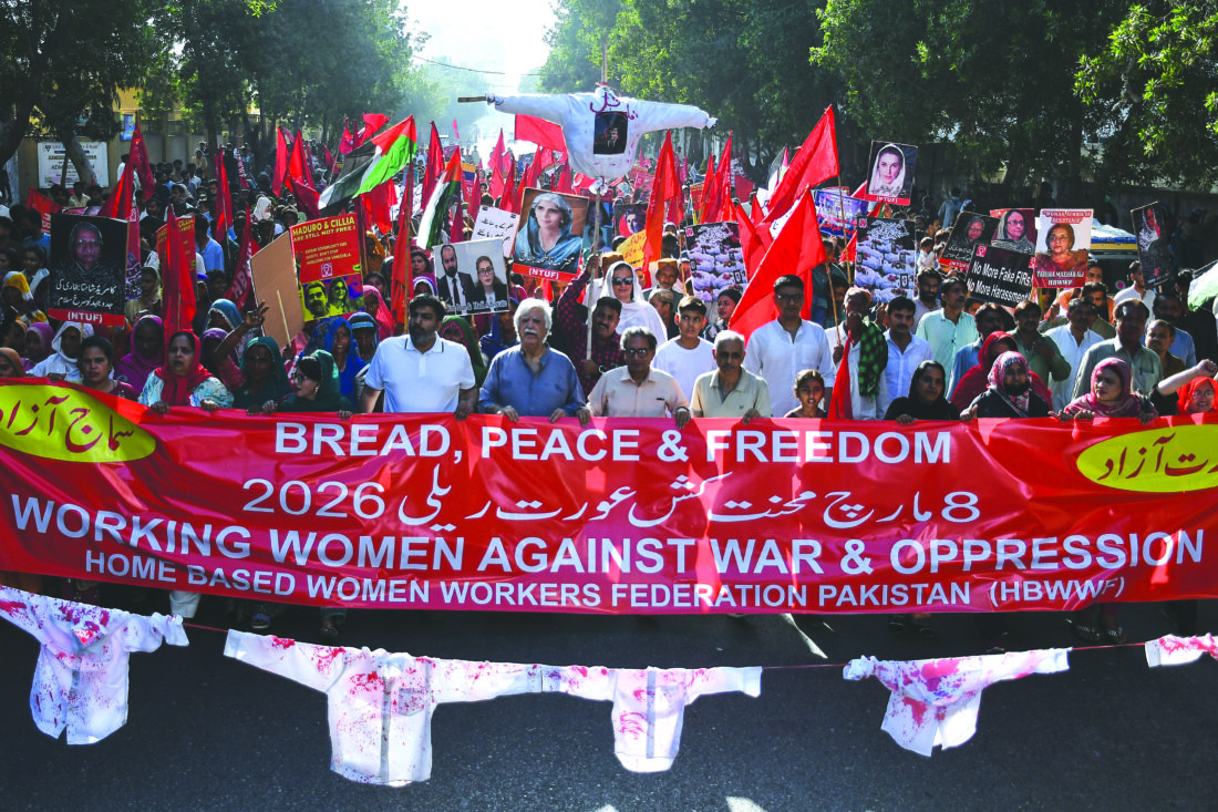 Women's right activists take part in a rally to mark International Women's Day, in Karachi, Pakistan, Sunday, March 8, 2026. (AP Photo/Ali Raza)