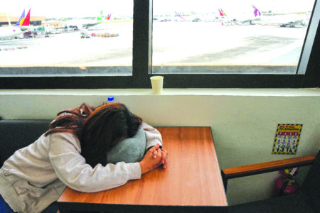 An overseas Filipino worker sleeps as she waits for updates on her cancelled flight to the Middle East at Manila's International Airport, Philippines on Monday, March 2, 2026. (AP Photo/Aaron Favila)