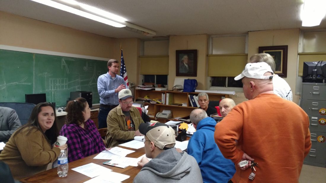 T-L Photo/LENNY WITTENBROOK Cody Gilliam of Rice Energy, standing, talks with Belmont village officials about obstacles to a planned road widening project.