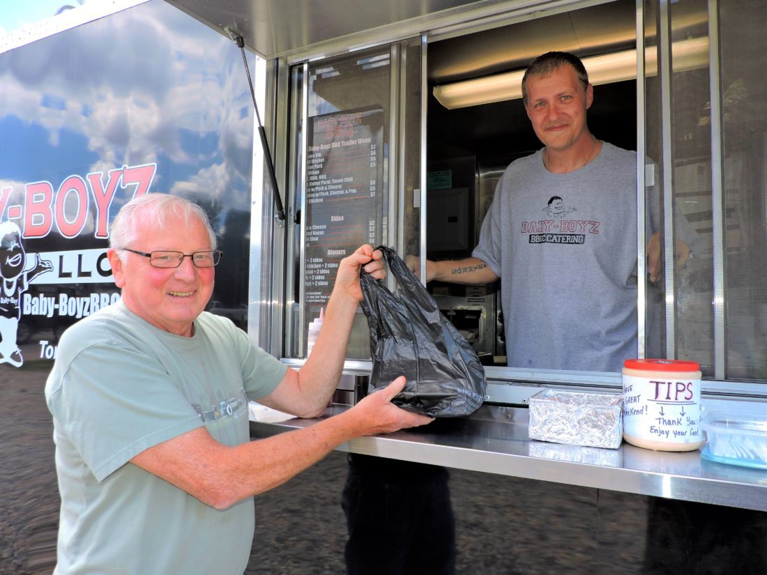 MARTINS FERRY resident Dale Travis, left, gets his rib order from J. Jay Hall of Baby-Boyz BBQ of Toronto on Monday beside the farmers’ market lot on Hanover Street. The first market is set for 10 a.m. to 2 p.m. Friday. T-L Photo/ SHELLEY HANSON