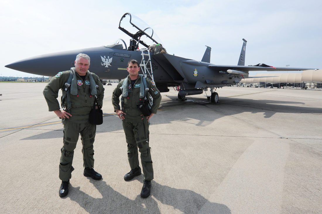 SEYMOUR JOHNSON AIR FORCE BASE, N.C. Lt. Col. David Moeller and Capt. Joseph Stenger pose in front of the 335th Flagship F-15E Strike Eagle after its maiden flight with heritage patches here July 19, 2011. Air Combat Command officials approved the patches to be displayed until May 2012. Moeller, 335th FS commander, hails from Moreno Valley, Calif., and Stenger, 335th FS pilot, is a native of Barnsville, Ohio. (U.S. Air Force photo by Senior Airman Rae Perry/RELEASED)