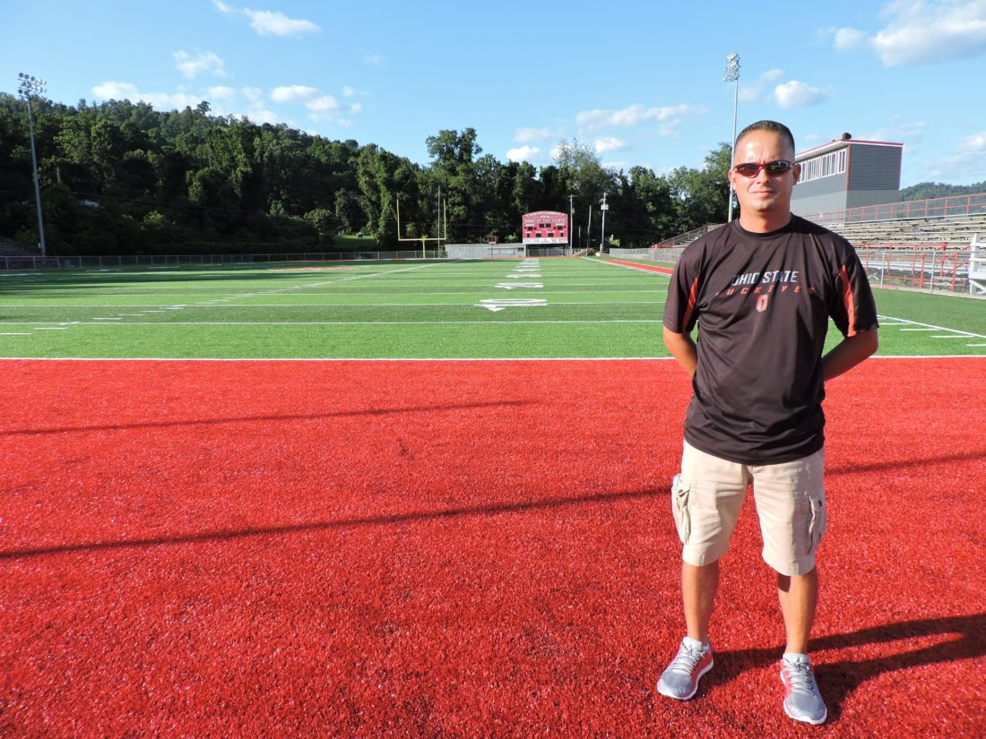 T-L Photo/JANELL HUNTER/ River High School Principal Ed Trifonoff shows off the new turf at Flannery Field.