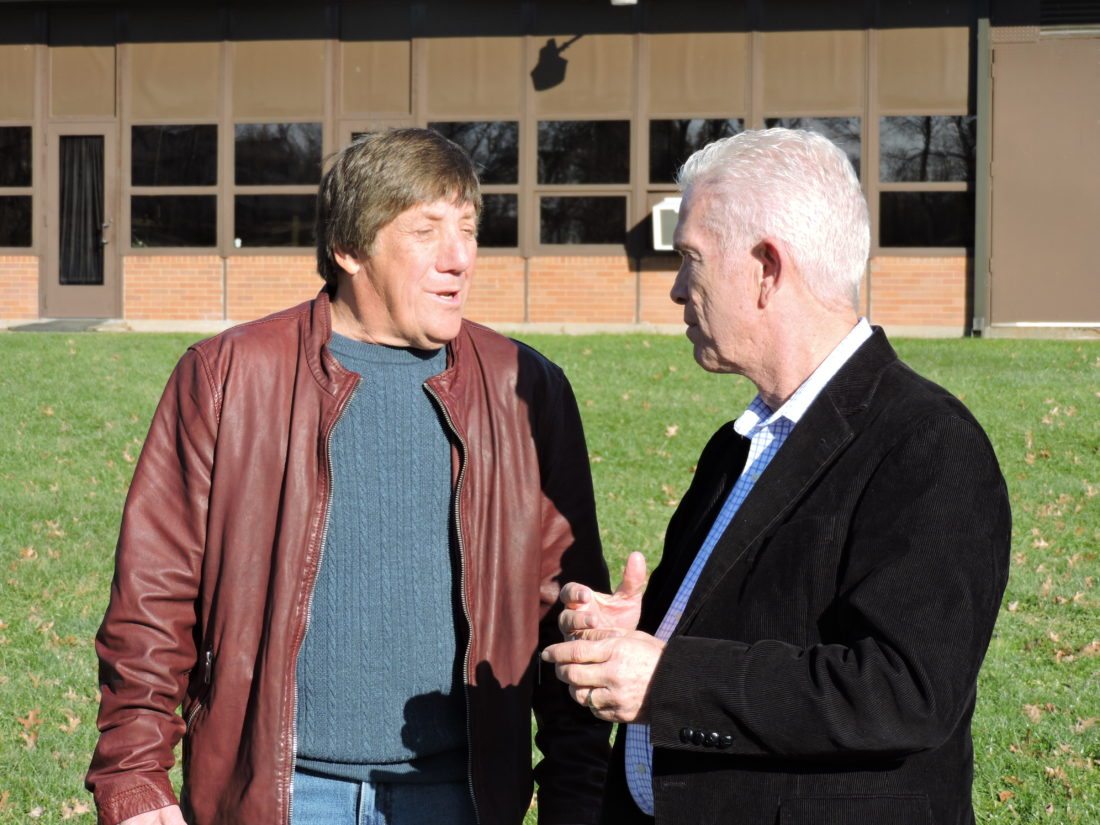 T-L Photo/DYLAN MCKENZIE Cadiz Mayor Ken Zitko, left, talks with Congressman Bill Johnson, R-Ohio, on Monday. The two officials have been working to help secure a temporary post office for the village, which has been without a physical office since early September.