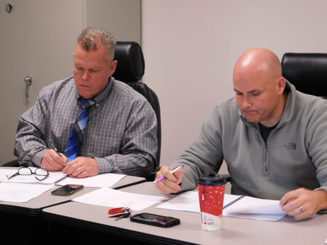 Martins Ferry City School Superintendent Jim Fogle, left, and board member Brian McFarland and other board members went into executive session Thursday and came to no decision in the matter of the district treasurer, who has been suspended with pay for almost half a year.