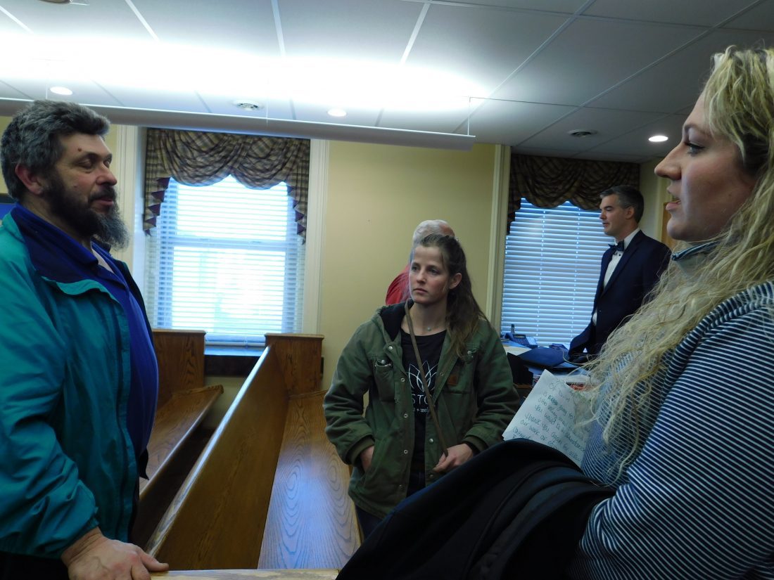 T-L Photo/ROBERT A. DEFRANK Pultney Township Trustee Frank Shaffer asks questions of Hannah Carpenter, operations manager with Belmont Soil & Water Conservation District, about ongoing and future projects after a presentation Feb. 27. Forestry/Wildlife Specialist Liza Butler observes and Belmont County Commissioner Josh Meyer speaks to another guest.