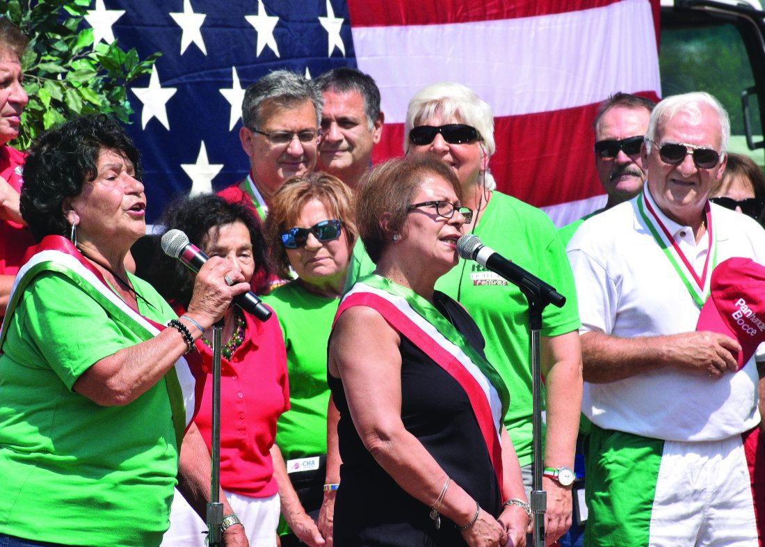 Photos by Scott McCloskey Lucia Scaffidi of Steubenville, left, and Mariella Pitterra of Steubenville, center, open the 31st Annual Undo’s Upper Ohio Valley Italian Heritage Festival at Wheeling Heritage Port on Friday with the singing of the Italian national anthem.