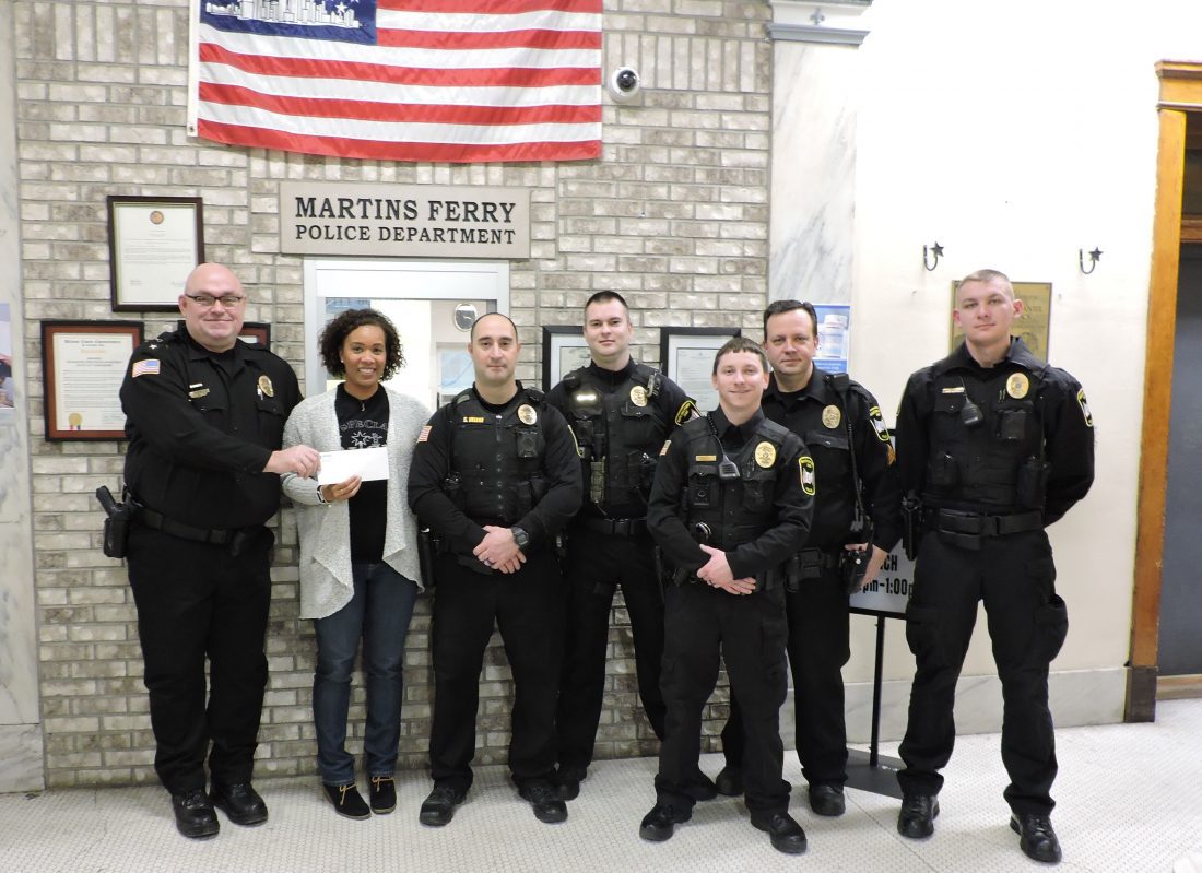 T-L Photos/CARRI GRAHAM Officers of the Martins Ferry Police Department present A Special Wish Foundation Executive Director Alicia Freeman with a check on Tuesday afternoon at the police department in Martins Ferry. The department raised $1,500 for the organization. Shown from left are Police Chief John McFarland, Freeman, Officers Steve Veltri, John Holmes, Robert Ney, Sgt. Vern Trigg and Officer Kade Carpenter.