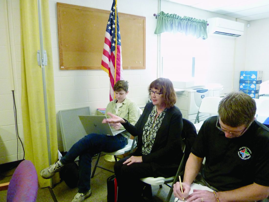 Photo/Linda Comins Lea Harper, center, of Bowling Green, Ohio, and Bev Reed, left, of Bridgeport talk to the Belmont County Board of Health about fracking waste and air pollution. Rich Lucas, county director of environmental health, listens to their presentations.