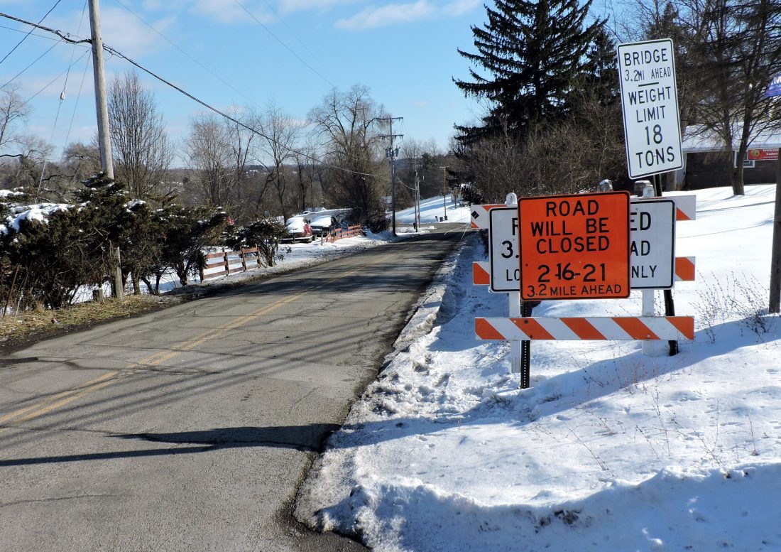 Signs posted at the entrance of Belmont County Road 4, Colerain Pike, off of U.S. 250 in Colerain Township alert residents to the impending closure of the roadway. Beginning Feb. 16, the road will be closed in both directions for around four weeks for a bridge repair project.