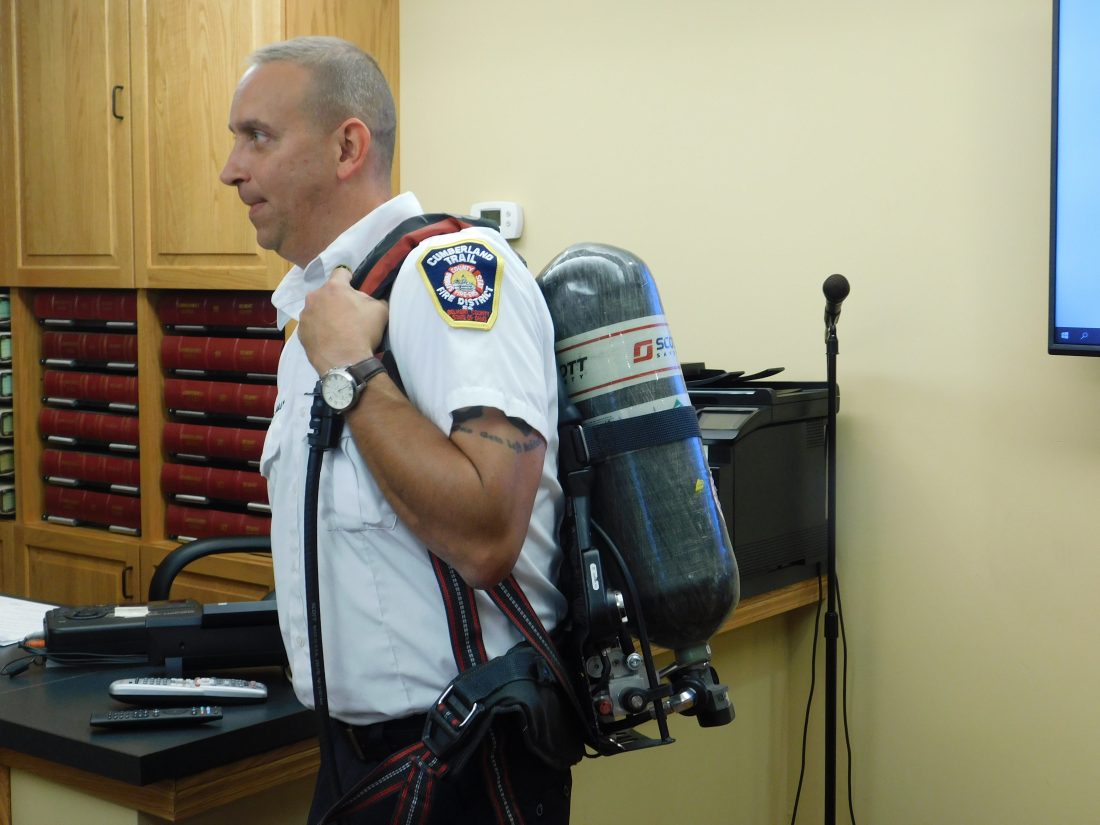He and Assistant Chief Dan Grady demonstrated the use of a self-contained breathing apparatus, which feeds air from the 40-pound tank to a firefighter on duty in a dangerous location.