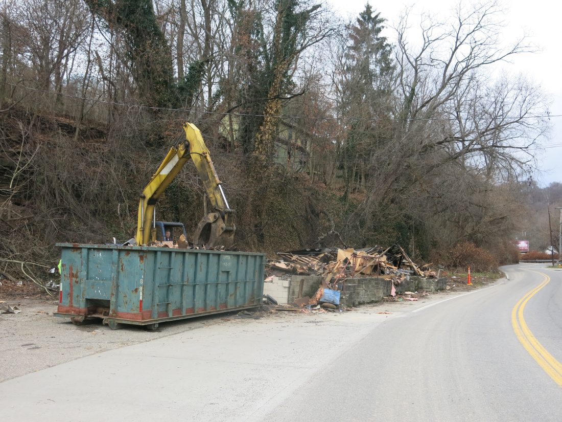 Contracted to tear down the old Cravat Coal building that stood just above Wilson Furniture along U.S. 250, he spent a good part of the week doing just that. Under the name of his business, Trucks ‘N Tracs, Davies by Friday had largely taken the building down for Jason Wilson of Wilson Furniture. Wilson, who purchased the blighted building and land before the structure caught fire and was destroyed a few weeks ago, will use the property for extra parking space for his businesses. He also has a U-Haul business at the Bridgeport site.