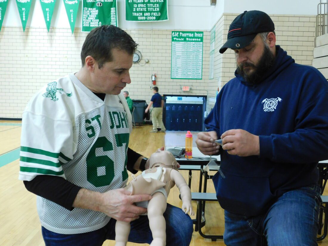 Chris Bryniarski, a 1985 graduate of St. John and the class valedictorian, is the chief financial and operations officer of Prestan Products. He made the donation and said each dummy has a computerized system that measures the responders’ efforts at rendering aid.