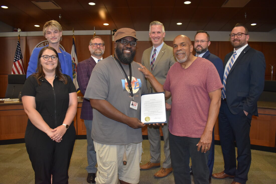 Photo by Eric Ayres Wheeling City Council last week took official action to proclaim June 19 as Juneteenth Independence Day in the city of Wheeling, encouraging all residents to take part in Juneteenth ceremonies and activities in celebration commemorating the end of slavery in the United States. In front, from left, are Alex Panas of Wheeling Heritage, Ron Scott of the YWCA and Owens Brown of the NAACP. In back, from left, are Wheeling City Council members Rosemary Ketchum, Jerry Sklavounakis, Mayor Glenn Elliott, Vice Mayor Chad Thalman and Ty Thorngate.