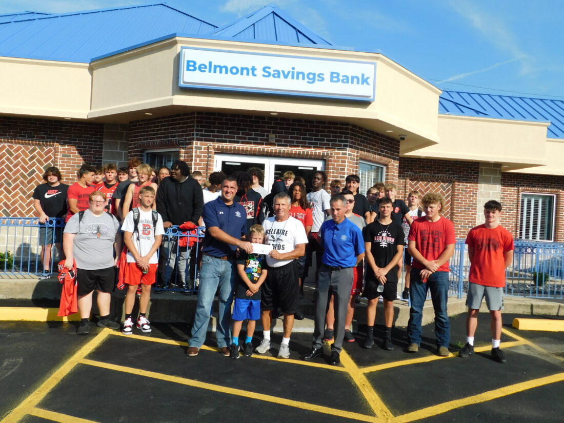 T-L Photo/ROBERT A. DEFRANK Todd Cover, left, president of Belmont Savings Bank, and Branch Manager Courtney Smith, right, make a donation to Bellaire Local Schools District’s football team and Coach Mark Bonar Thursday during a block party celebrating the opening and ribbon cutting of the new branch location on 34th St., Bellaire. They are joined by Bonar’s grandson, Jackson Quirk, and the football team.