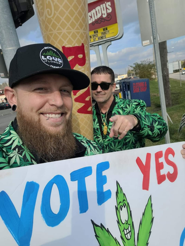 Photos Provided Matthew Cooper of Martins Ferry, left, and William Schmitt Jr., owner of Holistic Cloud and newly elected Bellaire councilman, rally at the corner of Aetna Street and Ohio 7 in Martins Ferry earlier this year to encourage voters to support Issue 2 to legalize recreational marijuana for adults in Ohio. Voters approved the measure Nov. 7, but lawmakers are now debating changes to it.
