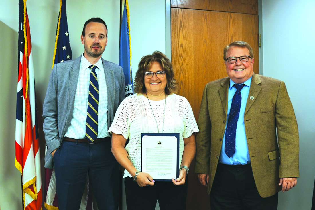 T-L Photo/GAGE VOTA Belmont County Commissioner J.P.Dutton, left, Executive Director of Senior Services of Belmont County Lisa Kazmirski, and Belmont County Commissioner Jerry Echemann pose with the proclamation declaring May to be Older Americans Month.