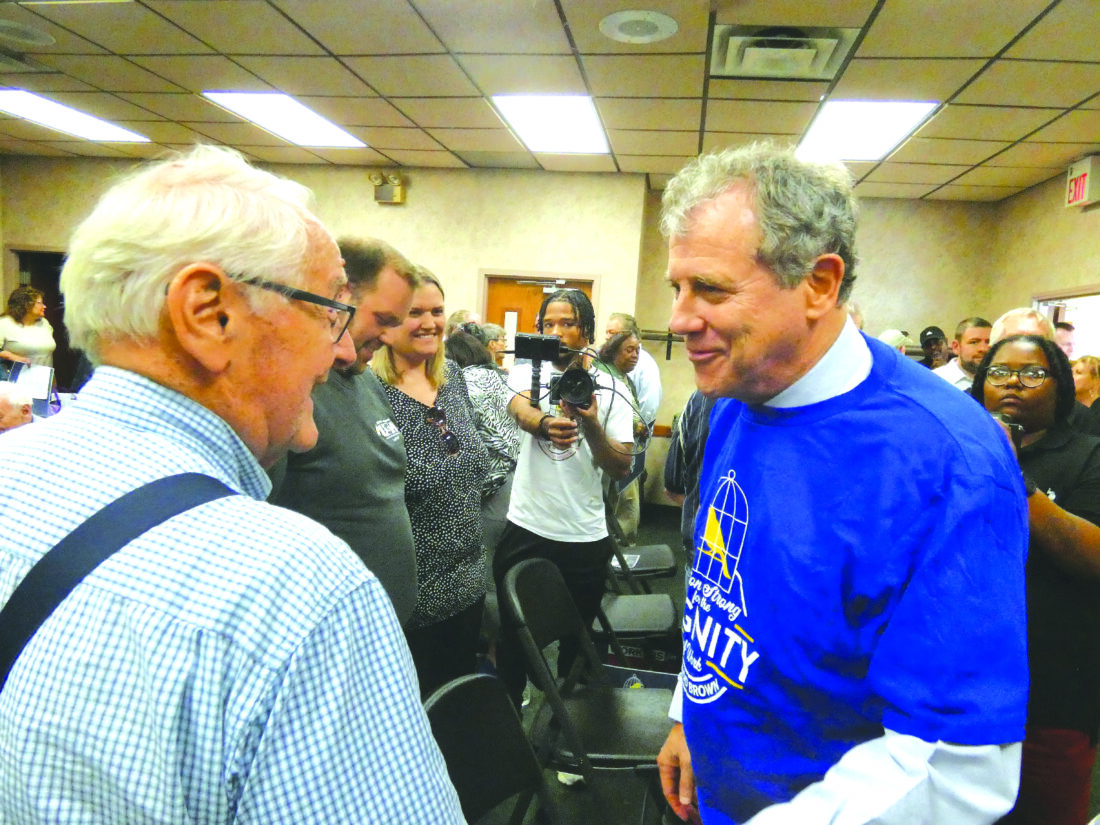 Photo by David Skolnick U.S. Sen. Sherrod Brown, D-Ohio, right, talks with John Gamble of Winona during a Tuesday campaign stop at the United Steelworkers Local 2155 union hall in Niles.
