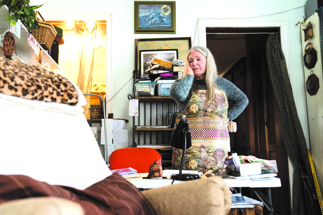 FILE - Nancy Rose, who contracted COVID-19 in 2021 and exhibits long-haul symptoms including brain fog and memory difficulties, pauses while organizing her desk space, Jan. 25, 2022, in Port Jefferson, N.Y. (AP Photo/John Minchillo, File)
