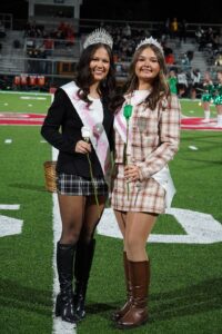 AJ Empeno, left, smiles after she was crowned Barnesville’s homecoming queen on Friday with Maleah Farrell as runner-up. The crowning took place during the Shamrocks’ game against Linsly, with Barnesville topping the Cadets 34-7.
