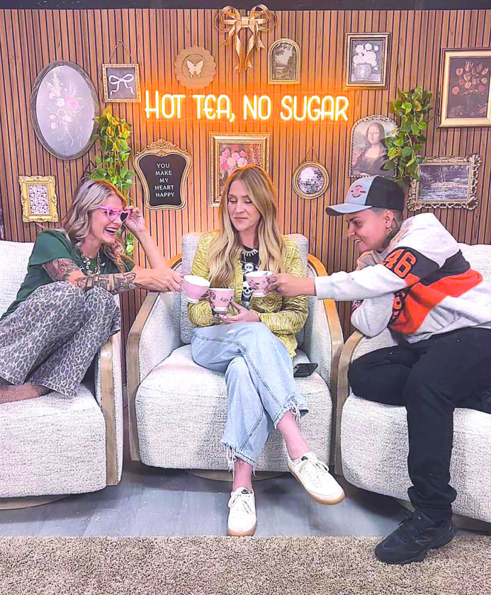 Photo Provided Hot Tea, No Sugar hosts Taylor Baugh-McIntire, from left, Samantha Holcomb, and Kelsey Cromar on set at Rig Studio discuss a wide range of topics.