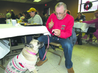 Photo by Shelley Hanson Wheeling Island resident Anthony Phillips gives his service dog, Angel, a piece of ham during the free Christmas day dinner at St. Luke’s Church in Wheeling on Thursday.
