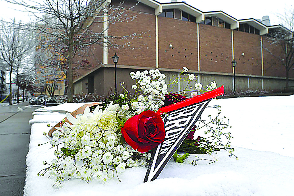 A bouquet of flowers rests on snow, Sunday, Dec. 14, 2025, on the campus of Brown University not far from where a shooting took place, in Providence, R.I. (AP Photo/Steven Senne)