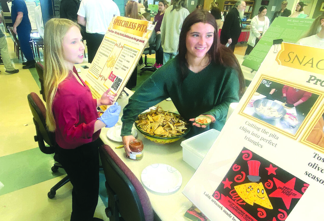 The college’s Speech 105 class put together a display for their “Speechless Pita” and “Snack-Stage Productions.” The group came up with the recipe for a healthy pita chip and presented that at Friday’s symposium, offering samples to guests. Some were packed in small plastic bags with logos created by some of the students.