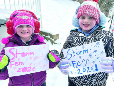 Photo provided The King sisters, Cali and Camdyn of Brookside, hold up homemade signs marking Winter Storm Fern 2026 while bundled up and playing in the snow on Sunday. They are the daughters of Terra and Josh King.