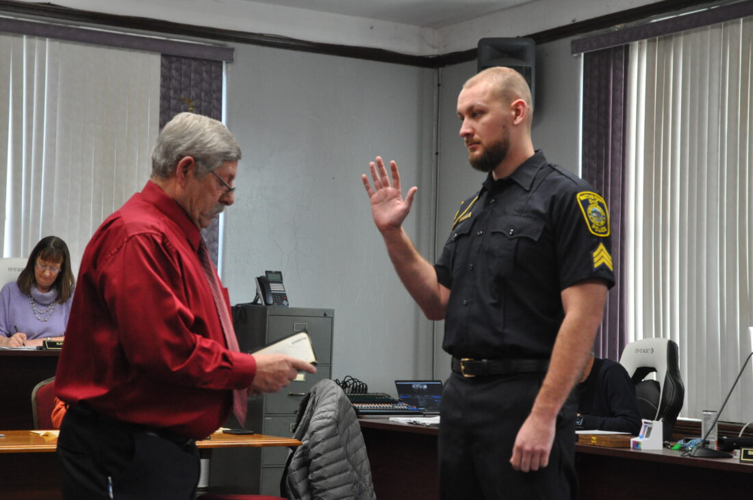 Martins Ferry Mayor John Davies (left) swears in city police officer Kade Carpenter, who was promoted to sergeant at the beginning of Wednesday’s council meeting. (Photo by Stephanie Elverd)