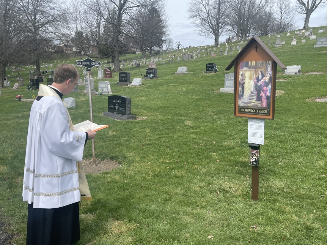 Photo by Ross Gallabrese The Rev. Bradley Greer, delegate of the apostolic administrator and chancellor of the Diocese of Steubenville, Wednesday blessed the Seven Sorrows of Mary Walking Path at Mount Calvary Cemetery.