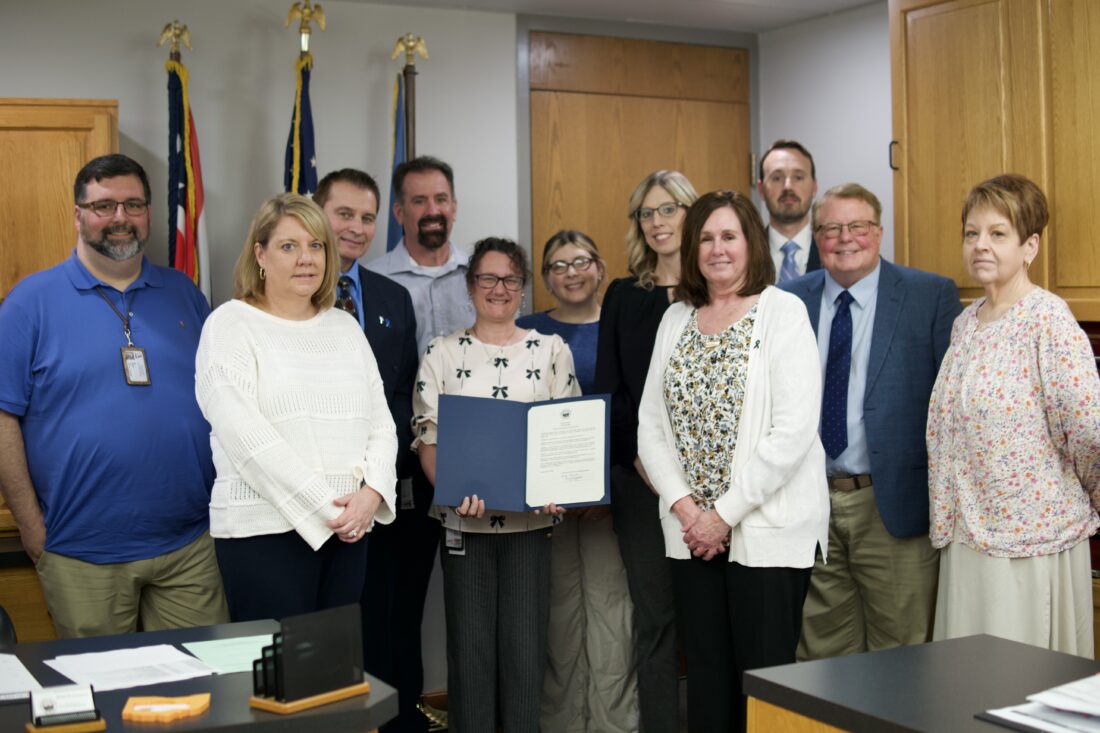 Belmont County Department of Job and Family Services Foster Care Caseworkers Ed Braun, from left, Nicole Couch, Belmont County commissioner Vince Gianangeli, caseworkers Jeff Edwards, Aubrey Erbach, Emily Cominsky, Jessica Cruse, administrator Christine Parker commissioner J.P. Dutton, Jerry Echemann, and Connect to Family program specialist Hope Romshak celebrate April being declared Child Abuse Prevention Month.