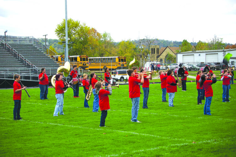 Bellaire High School band provides the music at the first Nelson Field Classic pep rally in preparation of Bellaire Big Reds rivalry game against Martins Ferry Purple Riders this coming Friday.