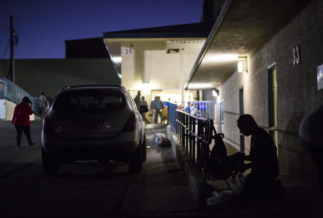 FILE - This Oct. 15, 2019, file photo shows a patron of The Salvation Army homeless shelter, right, checking his belongings at a shelter near downtown Las Vegas. Amid protests that they would criminalize being homeless, Las Vegas elected officials are poised to make it a misdemeanor for people to sleep or camp in public areas when beds are available at established shelters. (Chase Stevens/Las Vegas Review-Journal via AP, File)