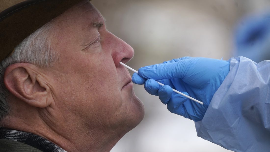 A member of the Salt Lake County Health Department COVID-19 testing staff performs a test on Gary Mackelprang outside the Salt Lake County Health Department Tuesday, Jan. 4, 2022, in Salt Lake City. (AP Photo/Rick Bowmer)