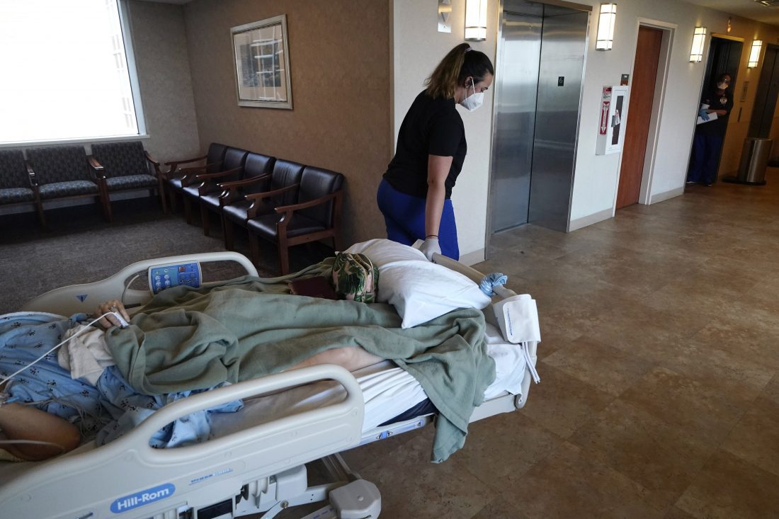 FILE - Medical staff transport a patient from a COVID-19 ward to the intensive care unit to be put on a ventilator, at the Willis Knighton Medical Center in Shreveport, La., Aug. 17, 2021. The explosive increase in U.S. coronavirus case counts is raising alarm, but some experts believe the focus should instead be on COVID-19 hospital admissions. And those aren't climbing as fast. (AP Photo/Gerald Herbert, File)