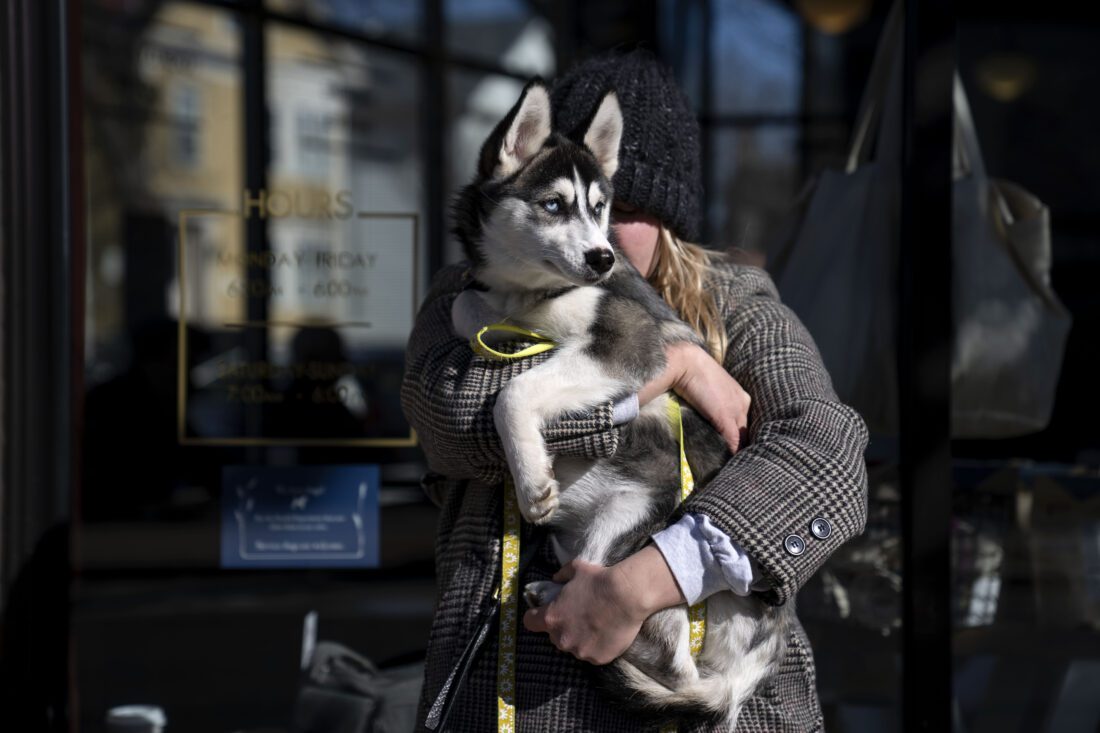 Madeleine Russell, buries her face into the fur of her 4-month-old Husky, Stevie Nicks, to stay warm while waiting for a friend outside a coffee shop in Providence, R.I., Friday, Feb. 3, 2023. A new wave of frigid weather rolling into the Northeast led communities to close schools and open warming centers Friday as an Arctic front swept in from Canada. (AP Photo/David Goldman)