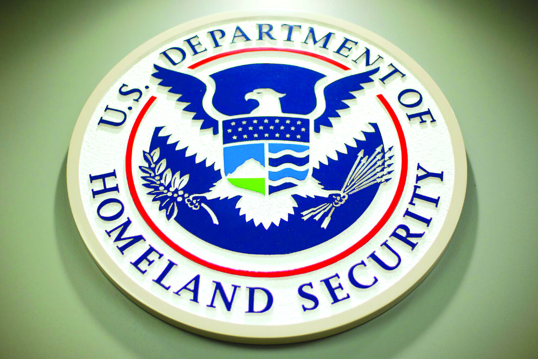 FILE - The Department of Homeland Security logo is seen during a news conference in Washington, Feb. 25, 2015. (AP Photo/Pablo Martinez Monsivais, File)