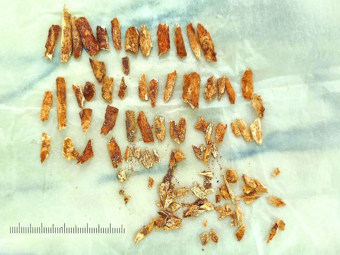 This photo provided by João Zilhão shows forearm bone fragments belonging to an ancient child that appeared to have features from both humans and Neanderthals. (João Zilhão via AP)
