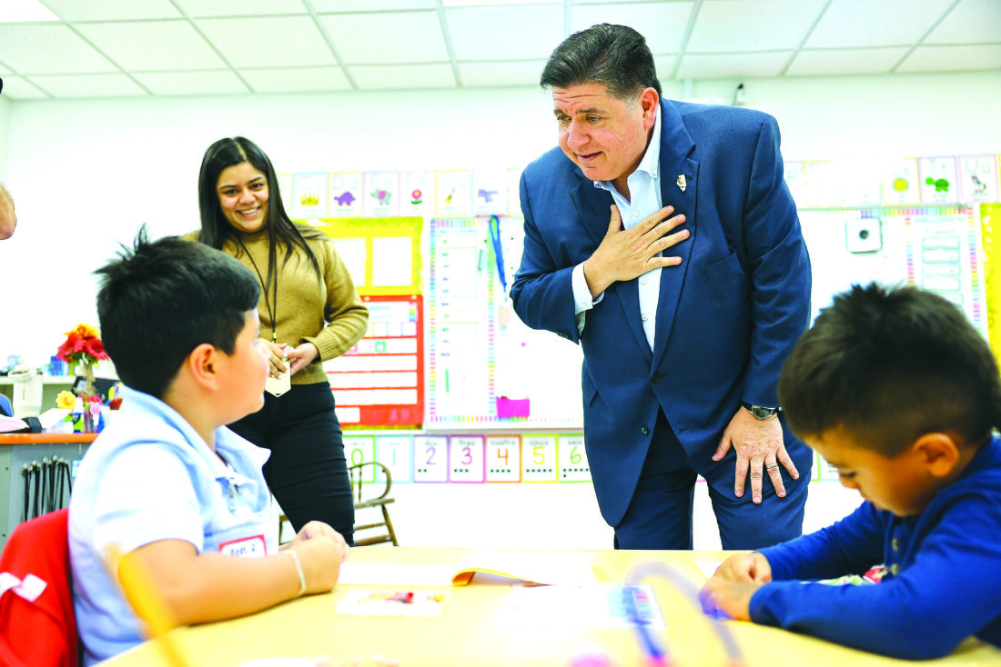 Gov. J.B. Pritzker speaks with kindergarten student at Prairie Oak Elementary School at 1427 Oak Park Ave. in Berwyn, Thursday, Sept. 4, 2025. (Anthony Vazquez/Chicago Sun-Times via AP, Pool)