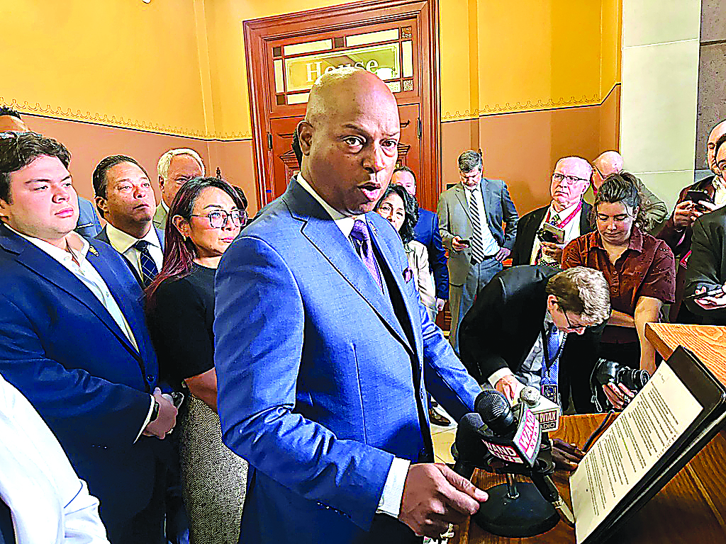 Illinois House Speaker Emanuel "Chris" Welch decries the federal government's Chicago immigration crackdown tactics and vows his Democratic caucus will adopt resolutions to condemn them in this Wednesday, Oct. 15, 2025 image at the state Capitol in Springfield, Il. (AP Photo John O'Connor)