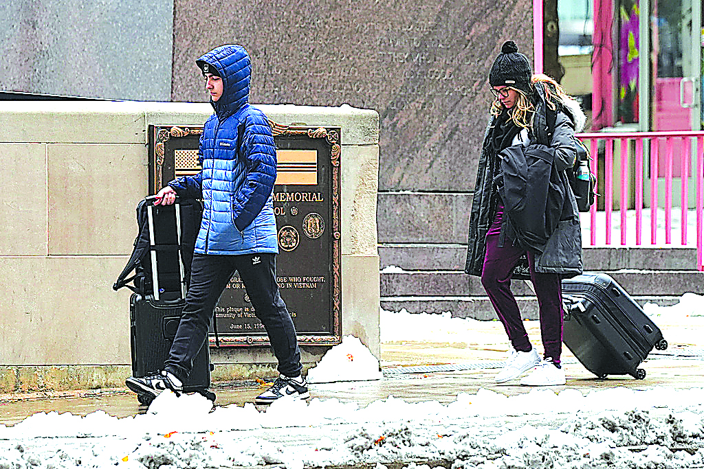 Pedestrians walk on the sidewalk during a cold day in Chicago, Tuesday, Nov. 11, 2025. (AP Photo/Nam Y. Huh)