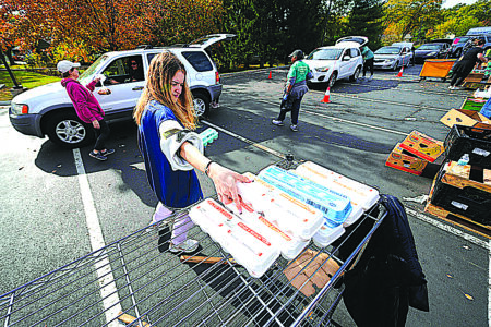 Volunteer Leticia Hassani gathers eggs to distribute to people at a drive-through food bank at the New Haven Seventh-Day Adventist Church Tuesday, Nov. 4, 2025, in Overland Park, Kan. (AP Photo/Charlie Riedel)