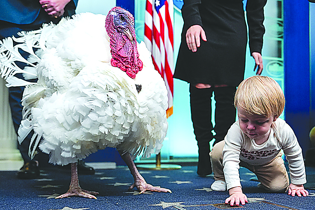 Nicholas, the son of White House press secretary Karoline Leavitt looks at Waddle, the alternate national Thanksgiving turkey, in the White House press briefing room, Tuesday, Nov. 25, 2025, in Washington. (AP Photo/Julia Demaree Nikhinson)