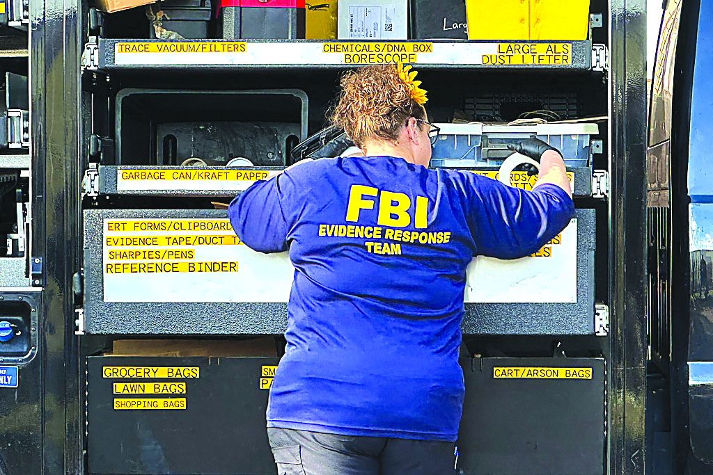 An FBI agent stands by an Evidence Response Team truck outside a home in a Dearborn, Mich., neighborhood on Friday, Oct. 31, 2025. (AP Photo/Mike Householder)