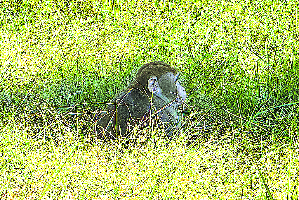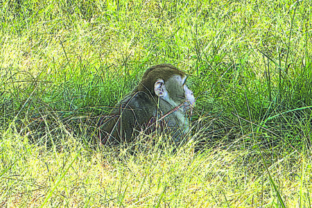 This photo provided by Scotty Ray Boyd shows an escaped monkey sitting in the grass Tuesday, Oct. 28, 2025, in Heidelberg, Miss. (Scotty Ray Boyd via AP)