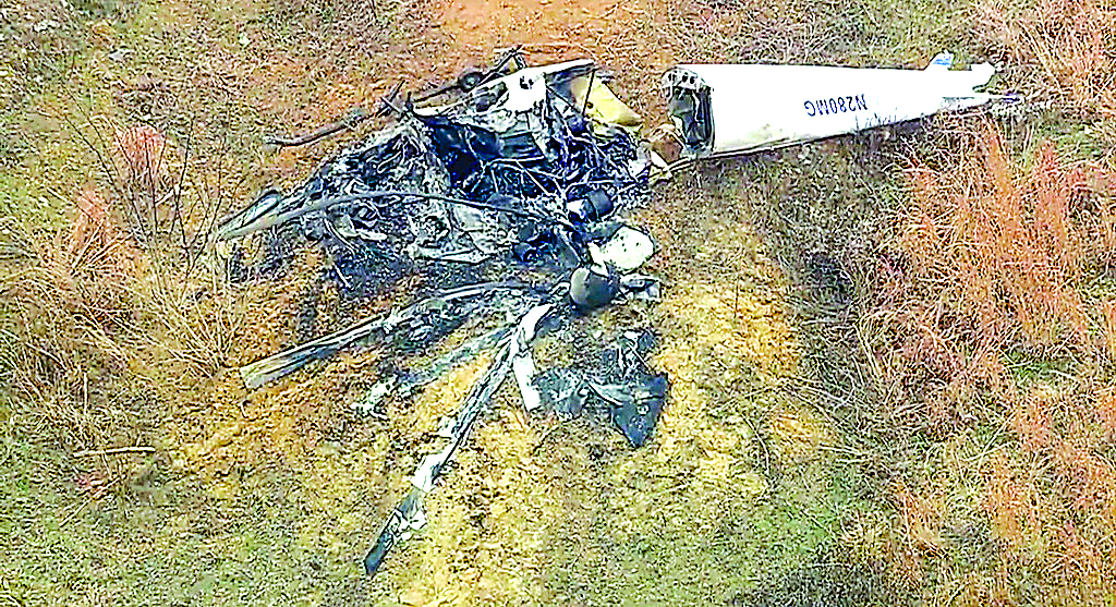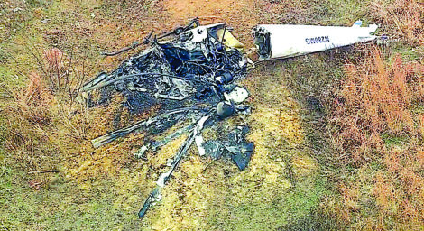 Debris from a helicopter is shown after two helicopters crashed in Hammonton, N.J., on Sunday, Dec. 28, 2025. (WPVI-TV/6ABC via AP)