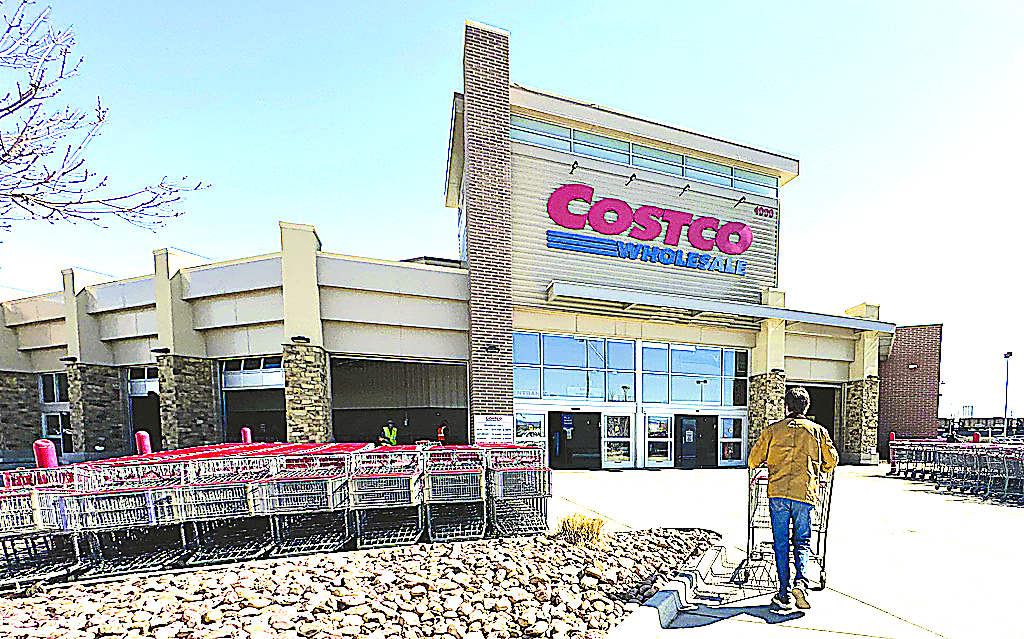 FILE - A lone shopper pushes a cart toward the entrance of a Costco warehouse, March 13, 2025, in Sheridan, Colo. (AP Photo/David Zalubowski, File)