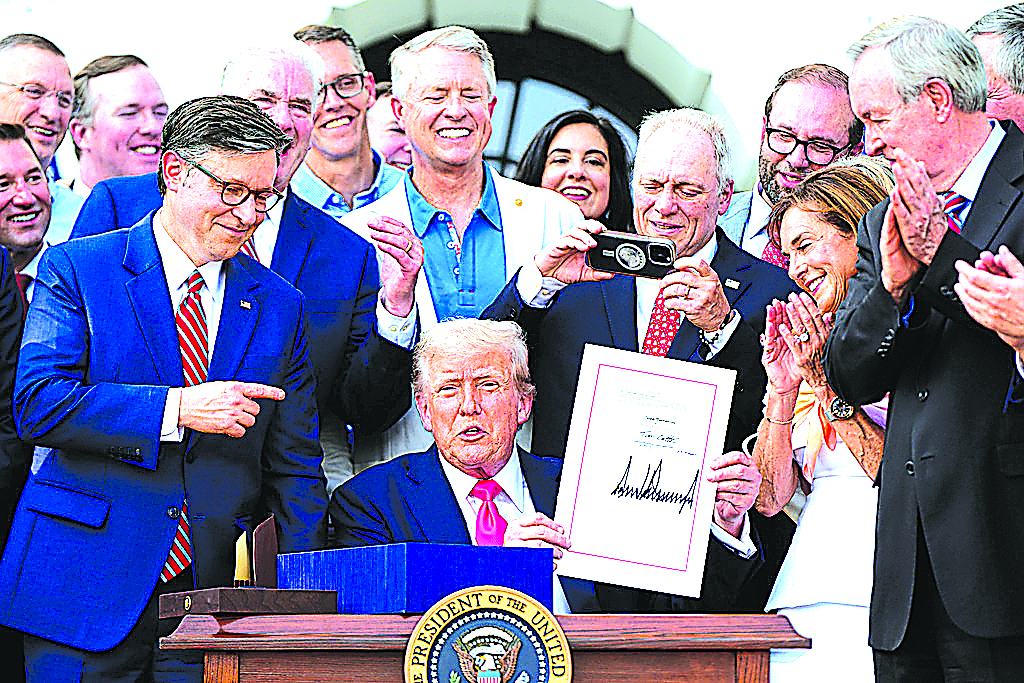 FILE - President Donald Trump holds his signed signature bill of tax breaks and spending cuts surrounded by members of Congress at the White House in Washington, on July 4, 2025. (AP Photo/Julia Demaree Nikhinson, File)